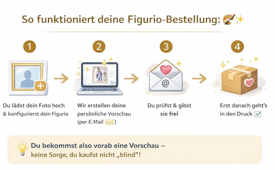 Wenn wir innerhalb von 7 Tagen keine Rückmeldung erhalten, gilt die Vorschau automatisch als freigegeben, und dein Figurio geht in den Druck.